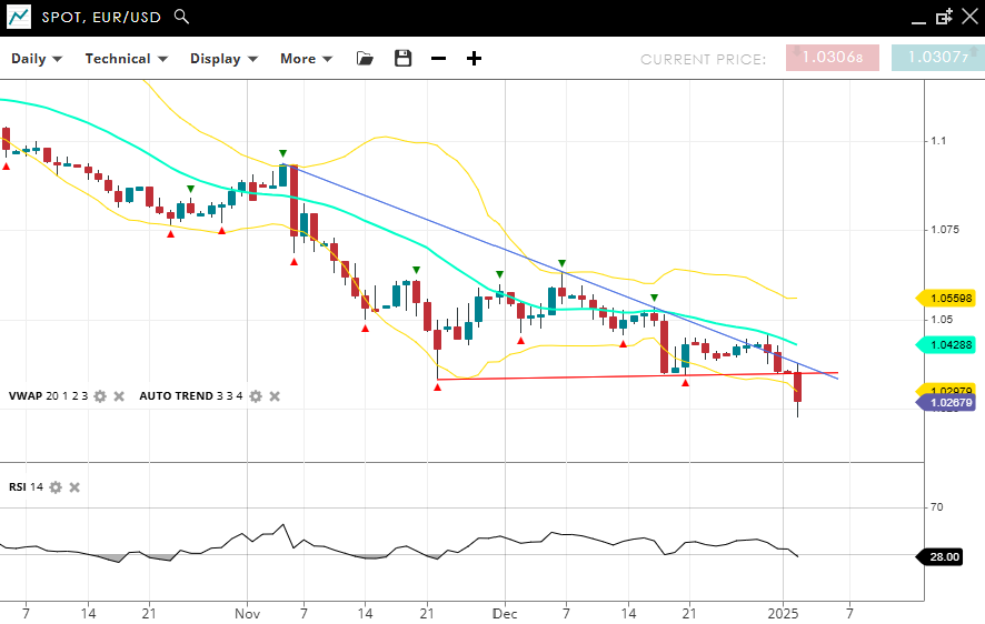 EUR/USD remains very bearish with euro-dollar parity coming into view. It is in an impulsive phase, trading at 1.0267, below the VWAP (20) of 1.0428 . Support is at 1.0297, with resistance at 1.0559. The RSI at 28 highlights oversold conditions, suggesting potential downside exhaustion.