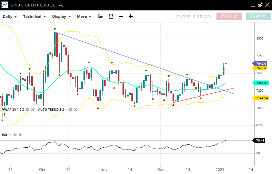 Brent Crude has finally flipped from its sideways range into a new bullish impulsive phase, trading at 7,642, above the VWAP (20) of 7,361. Support is at 7,144, while resistance is at 7,578. The RSI at 70 indicates overbought momentum, suggesting near term caution for further upside.