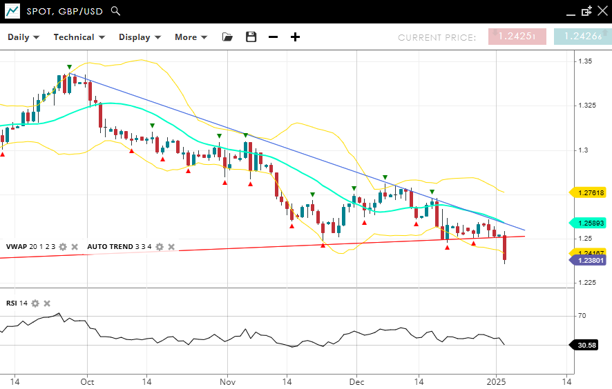 GBP/USD is in a bearish impulsive phase, breaking down below a rising trendline drawn by Autotrend trading at 1.2380, below the VWAP (20) of 1.2589. Support is positioned at 1.2416, with resistance at 1.2761. The RSI at 30 indicates bearish momentum, with the oversold level consistent with a strong downtrend.
