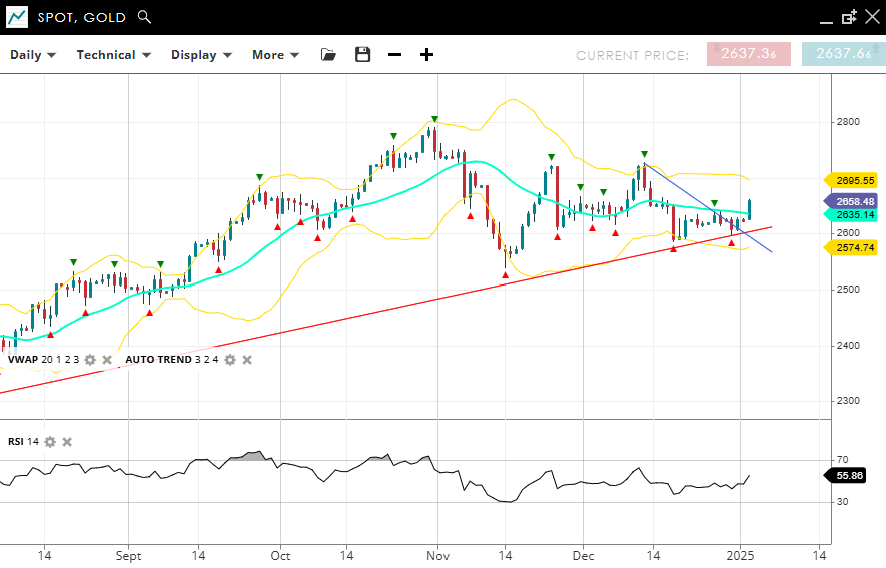 Gold remains neutral in a consolidation phase, trading at 2,658. It has just broken back over the VWAP (20) of 2,635, which has defined the top of a short-term range. Support is at 2,574, and resistance is at 2,695. The RSI at 55 shows balanced momentum with a new bullish tilt, but still consistent with the ongoing range-bound market.