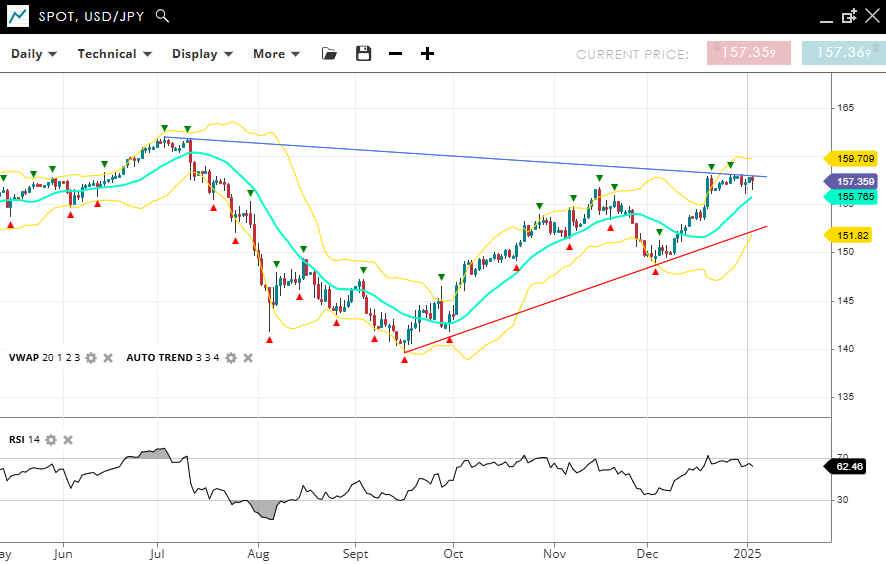 USD/JPY continues its bullish impulsive phase, trading at 157.35, above the November high and the VWAP (20) of 155.76. Support is at 151.82, with resistance at 159.70. The RSI at 62 reflects strong upward momentum, supporting the bullish trend.