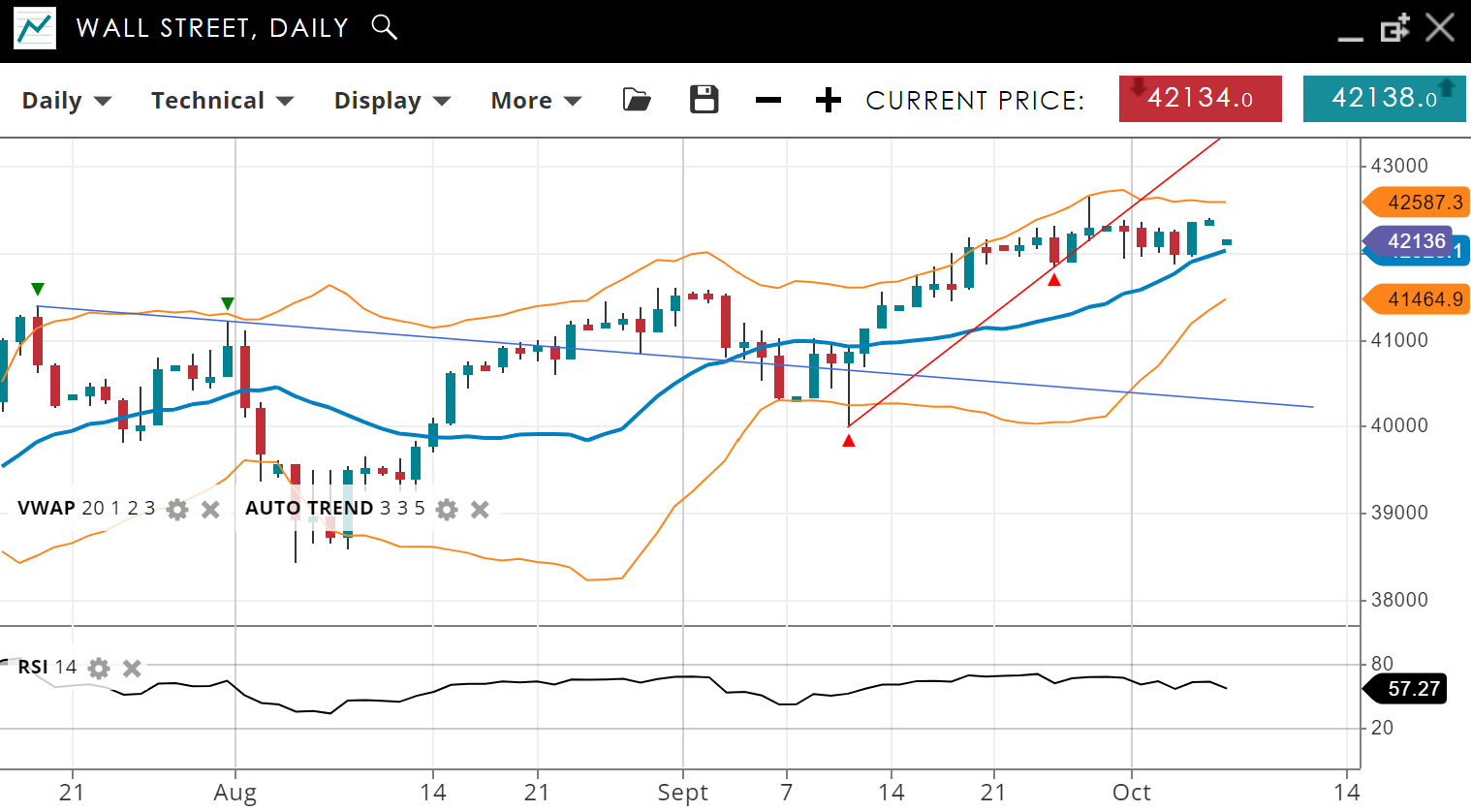 Wall Street remains in a bullish trend, with the price in an impulsive phase. The current price is 42,136, significantly higher than the VWAP (20) of 41,120. Support is at 41,464, with resistance at 42,587. The RSI of 57 reflects continued bullish momentum but within more moderated levels.