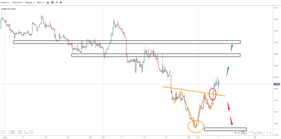 China  50 appears to be on an upside move following the completion of an inverse head-and-shoulders pattern. The rejection at the 12k handle could lead the price to 12750 next if 12250 gives in, and perhaps the 13k handle. Otherwise, the right-shoulder low at 11570 could be the last stronghold above 11150 low, which is the head.
