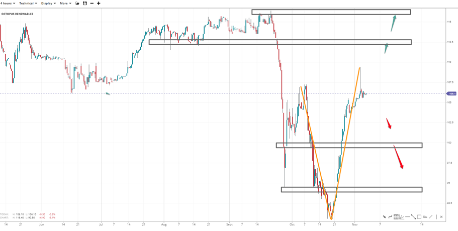 Octopus Renewables soared to 110.00 before turning lower but is likely to experience a pullback only. If the 100.00 handle holds, prices could spike to the next major resistance of 112.50 and 116.50. However, losing triple digits will expose the 90.00 record low, with interim levels at 97.50 and 95.00, with the latter having chances of being a ‘shoulder’ if the V-shaped recovery fails.