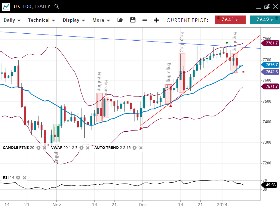 The index is showing a bullish trend with price consolidating around the 20-period VWAP of 7,676. Support lies at 7,571, and resistance is at 7,781. The RSI is at 49, hinting at a balanced market with potential for continued upward movement if buying pressure increases.