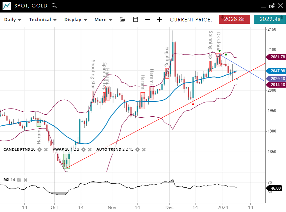 The commodity is bullish, but in a retracement with the price trading below the 20-period VWAP of 2,037. Support is found at 1,980, with resistance at 2,095. An RSI of 61 shows a healthy bullish trend without immediate overbought concerns, suggesting the potential for continued upward movement.