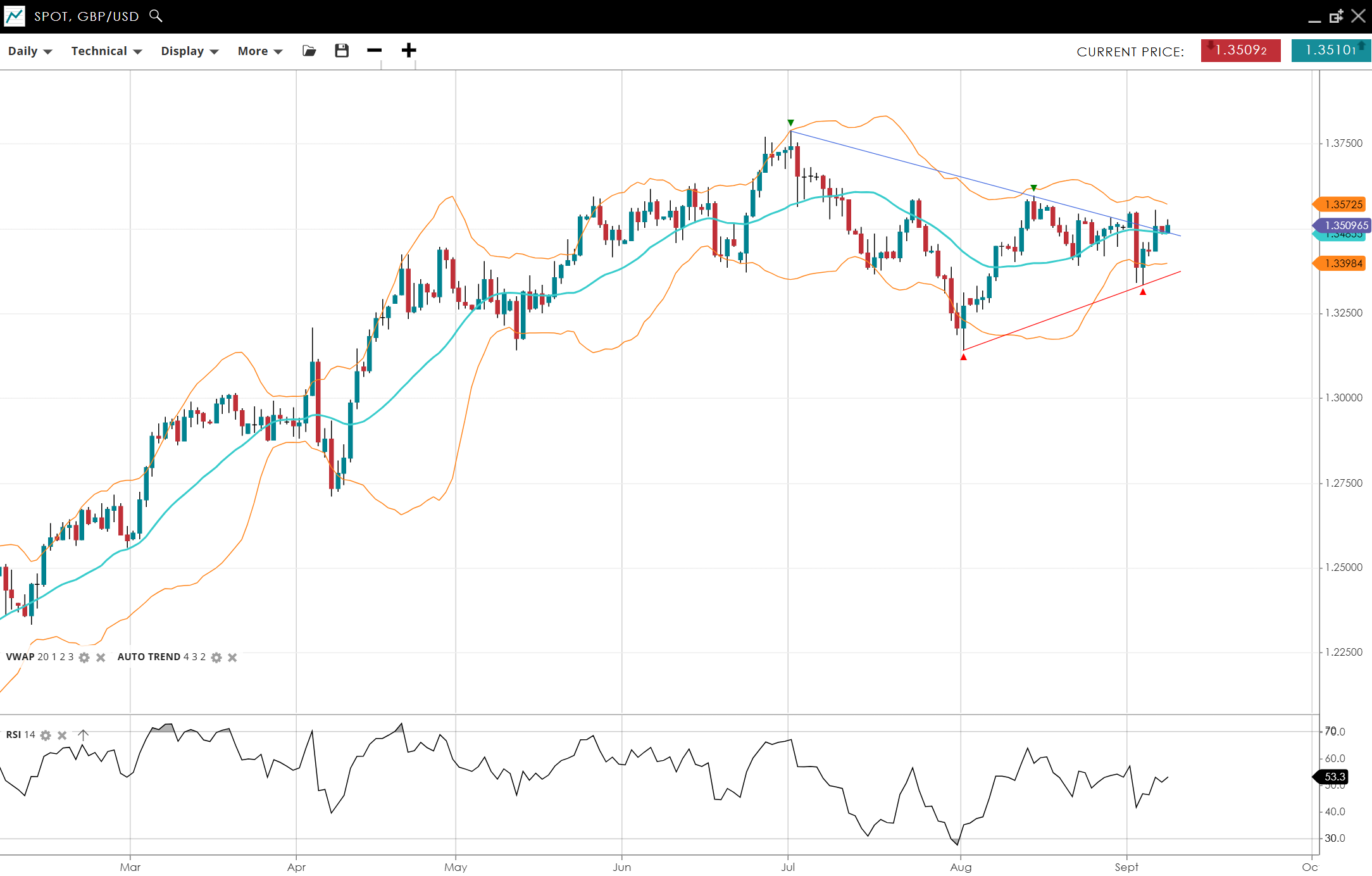 NOTE: These charts use the ‘Pro Trading Tools’ available on the SpreadEx trading platform. To use them, log in to your and click ‘Technical’ from the menu on any chart.