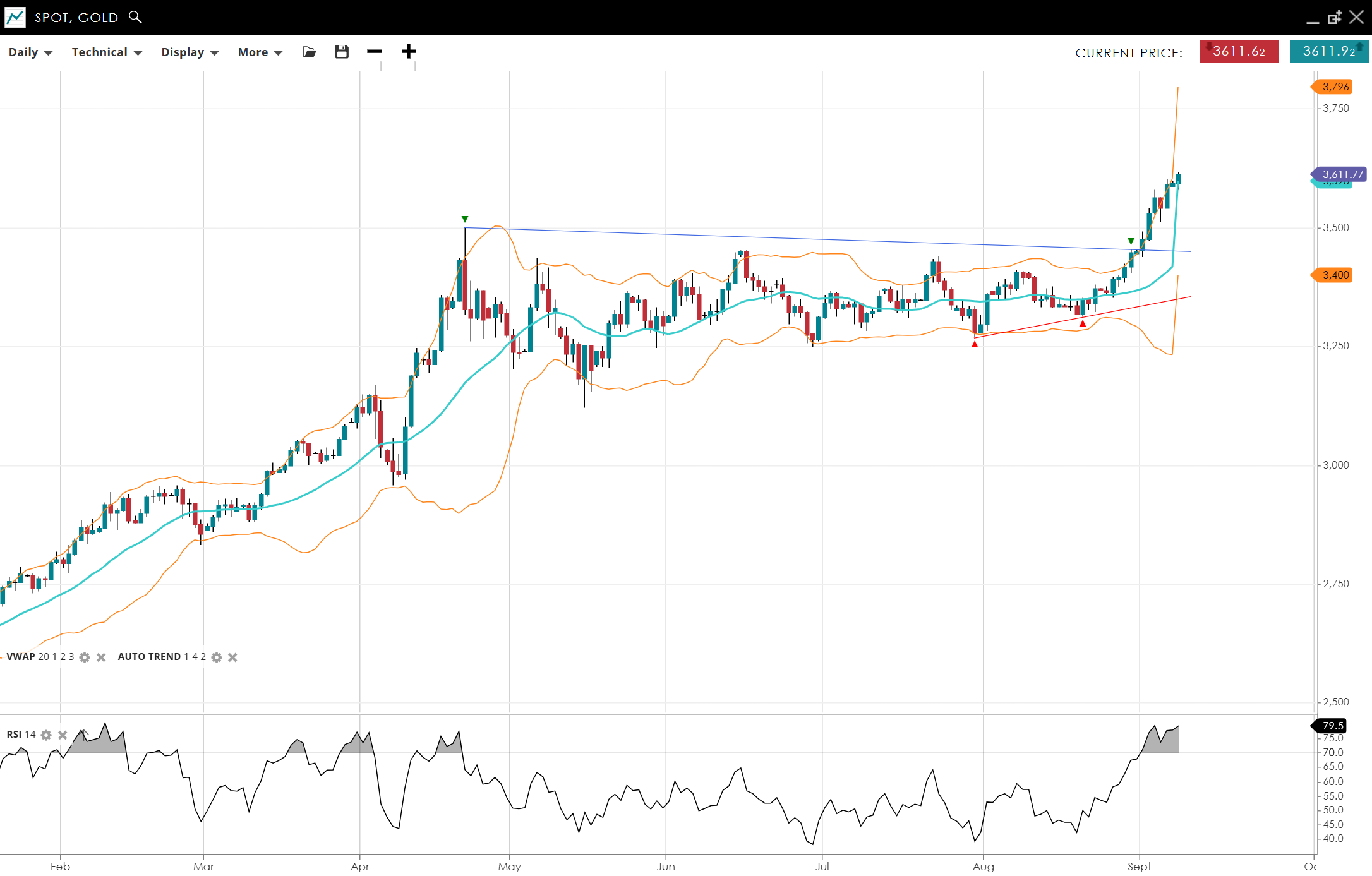 Gold has surged higher, trading at new record highs, currently 3,612 above VWAP 3,570 and breaking out of its multi-month consolidation. RSI at 80 indicates strong bullish momentum. Support is 3,400, resistance 3,796.