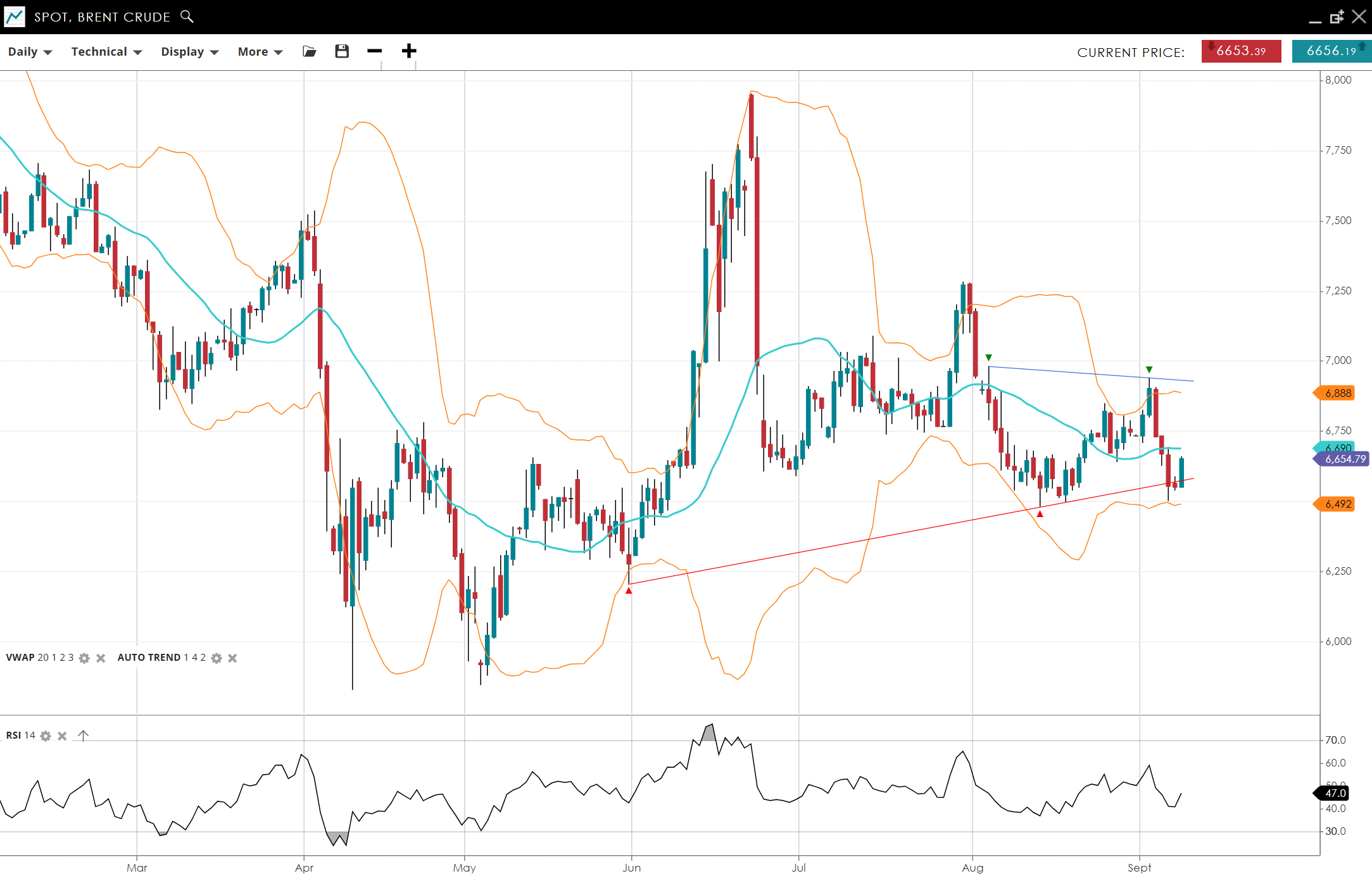 Brent Crude is still in a choppy range, at 6,654 the price is hovering around its VWAP of 6,690. RSI at 47 reflects neutral momentum. Support stands at 6,492, resistance at 6,888.