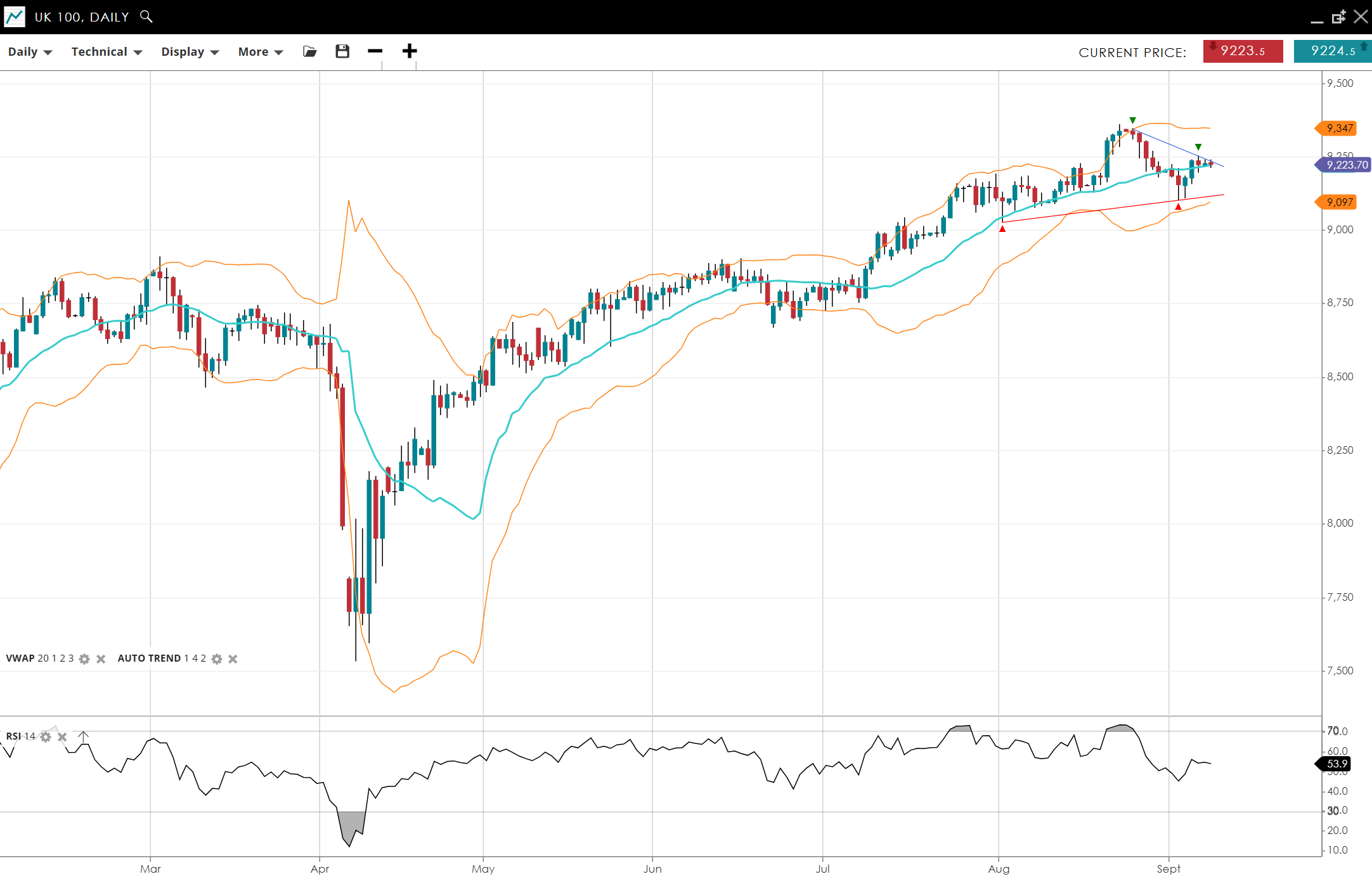 UK 100 remains bullish but has pulled back from recent highs down to its VWAP, trading at 9,224. RSI at 54 shows neutral-to-positive momentum. Support is 9,097, resistance is 9,347.
