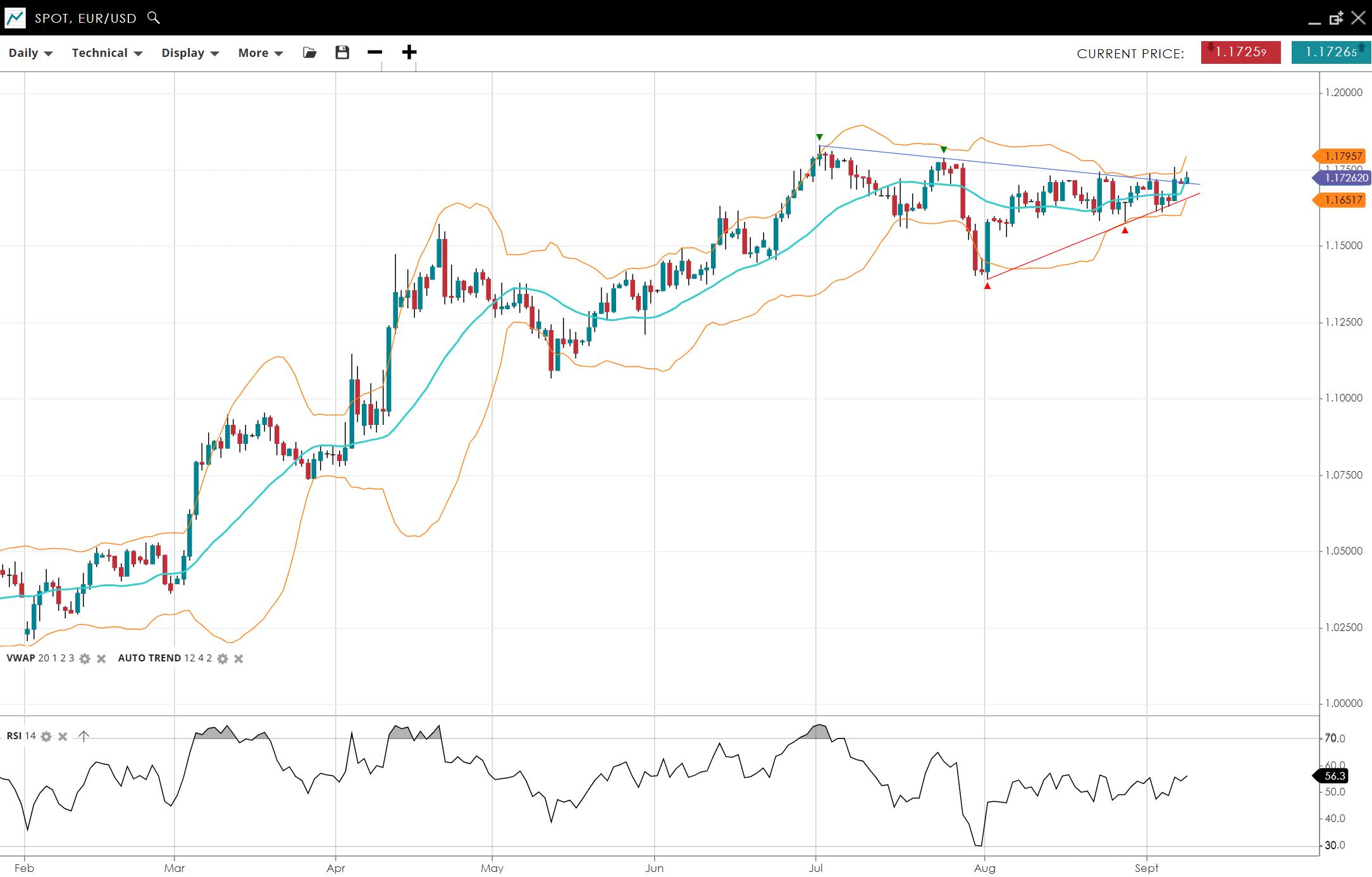 EUR/USD is pushing towards recent highs and a possible triangle breakout, trading at 1.1726 around VWAP 1.1726. RSI at 56 suggests balanced-to-bullish momentum. Support is 1.1652, resistance 1.1796.