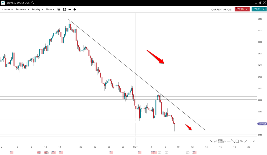 The price of silver is dropping aggressively where it managed to break the 2215 mark and close below it. Further movement to the downside is to be expected when the downtrend looks so healthy, but a possible correction to the 2210 USD resistance could be posted before the drop.