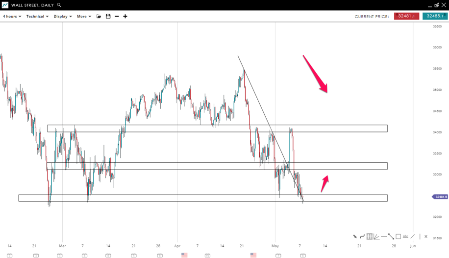 Wall Street failed to break the 32520 mark to the downside where a quick rebound has been posted to the previous swing high around the 34000 level. Now, The price is testing this zone again (32520) after breaking the bearish trend line. It is possible the market will reject the price around this area and this might lead to a reversal and a move higher to the previous swing around the 34k USD mark.