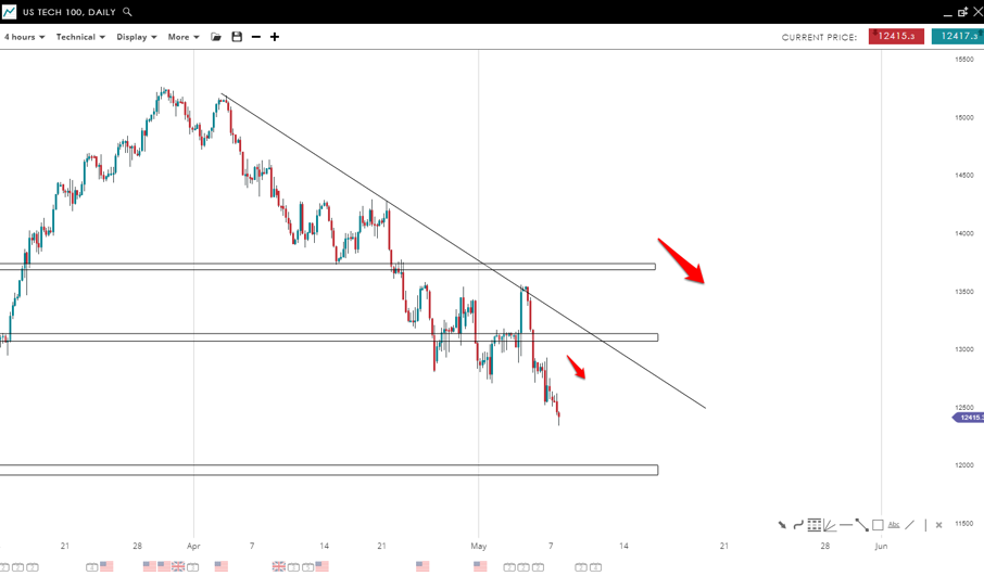 The Nasdaq 100 index is in a clear downward movement, and this occurred after breaking a strong demand zone around the 13,100 mark. Since there are no strong supports below this mentioned demand zone, there is a possibility that the sellers will push the price toward the 11,960 level.