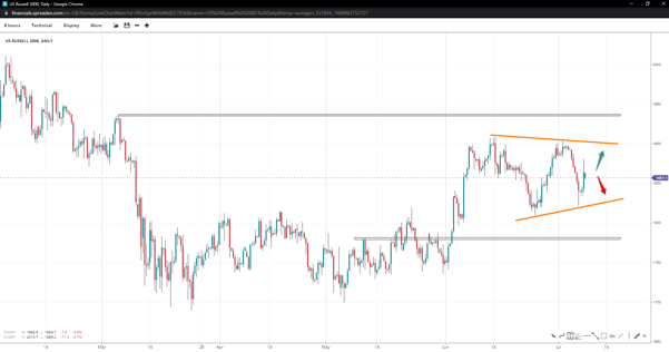 Price action in Russell 2000 resembles the beginning of a triangle as the index completed a lower high and a higher low versus its preceding swings. The break of 1905 or 1810 will either confirm or invalidate the pattern, paving the way to 1940 and 1780, respectively.