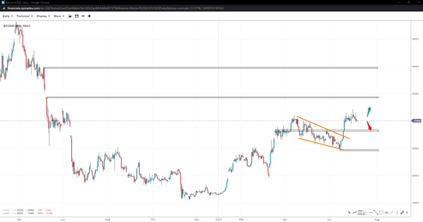 The price of Bitcoin has left a wedge pattern behind but has also put a top in, which can be considered a double top with a rejection by the 31k area. If bulls lose the support at 28350, a leg to 24500 may enact, raising chances of further continuation but also of a head-and-shoulders neckline low. Any upside above the local top at 32200 may instead see an extension to the gap low of 34230, with a recapture opening the door to 40k, pending resistance at 37180.