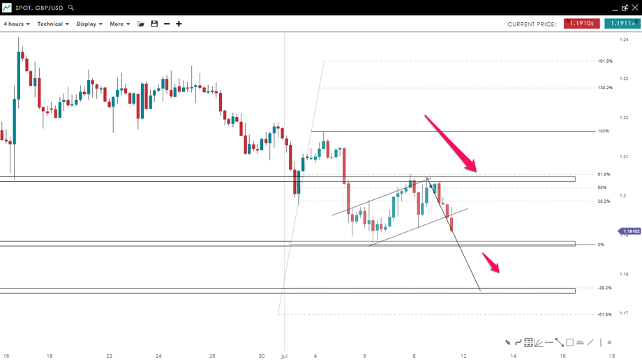 The price of “GBP/USD” is trending to the downside. The market successfully broke the bearish flag formation to the downside after finding sellers near the 61.8 % fibonacci retracement level. A downward movement in line with the downtrend is most probable to test the next support level around the 1.17 mark.