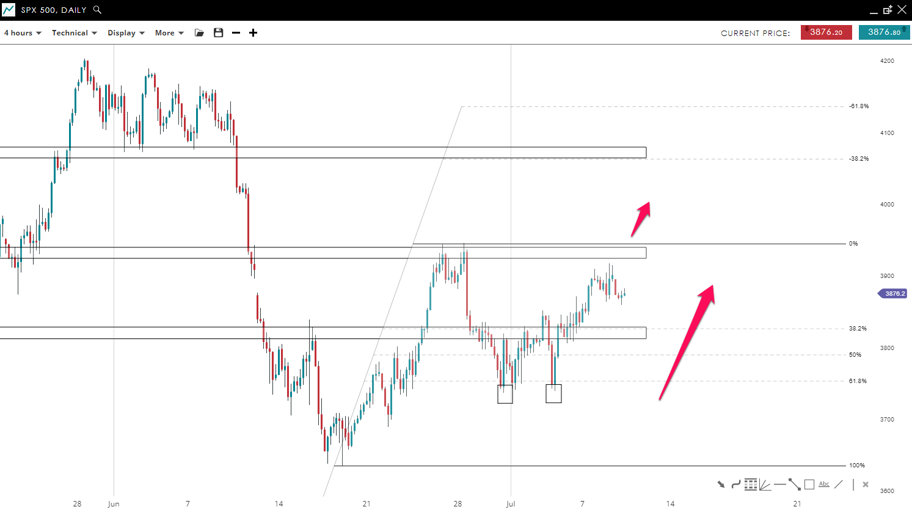 SPX500 reversed and moved higher after posting a double bottom formation near the 61.80 % fibonacci retracement level. The market is moving to the upside with a good momentum, which could lead to a break of the 3,940 mark to the upside and then a move all the way up toward the 4,070 mark.