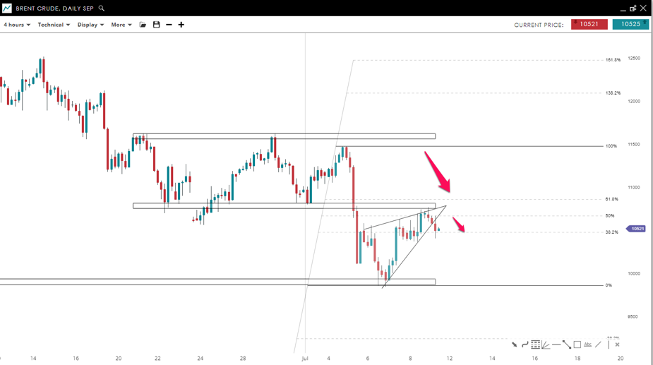 Brent Crude Oil successfully broke the parallel channel to the downside and entered inside a bearish pennant formation. The price found sellers near the 50 % fibonacci retracement level which led to a breakdown from the bearish flag. Further movement to the downside could be seen toward the next support level (99).