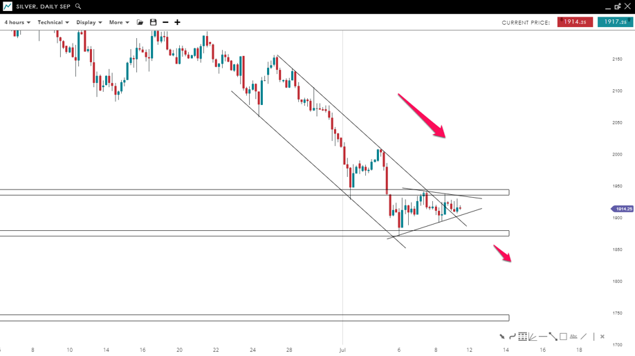 The price of “Silver” is trading inside a bearish channel formation where lower highs and lows have been posted. The market currently is bouncing inside a bearish pennant pattern. Since we are in a downtrend, there is a high chance to see the price breaking the pennant pattern to the downside to reach the 1,740 mark.