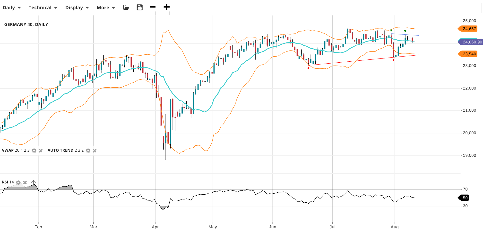 Germany 40 is in a range-bound environment, currently trading at 24,061, exactly at its VWAP of 24,061. RSI at 50 reflects balanced momentum. Support lies at 23,540 and resistance is seen at 24,657.