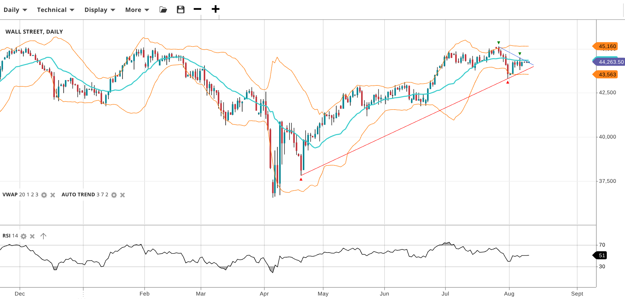 Wall Street remains bullish but is now in a corrective phase. Price has dropped to 44,264, right below its VWAP of 44,300. The RSI of 51 suggests a neutral outlook with mild bullish undertones. Support is at 43,563 and resistance is at 45,160.