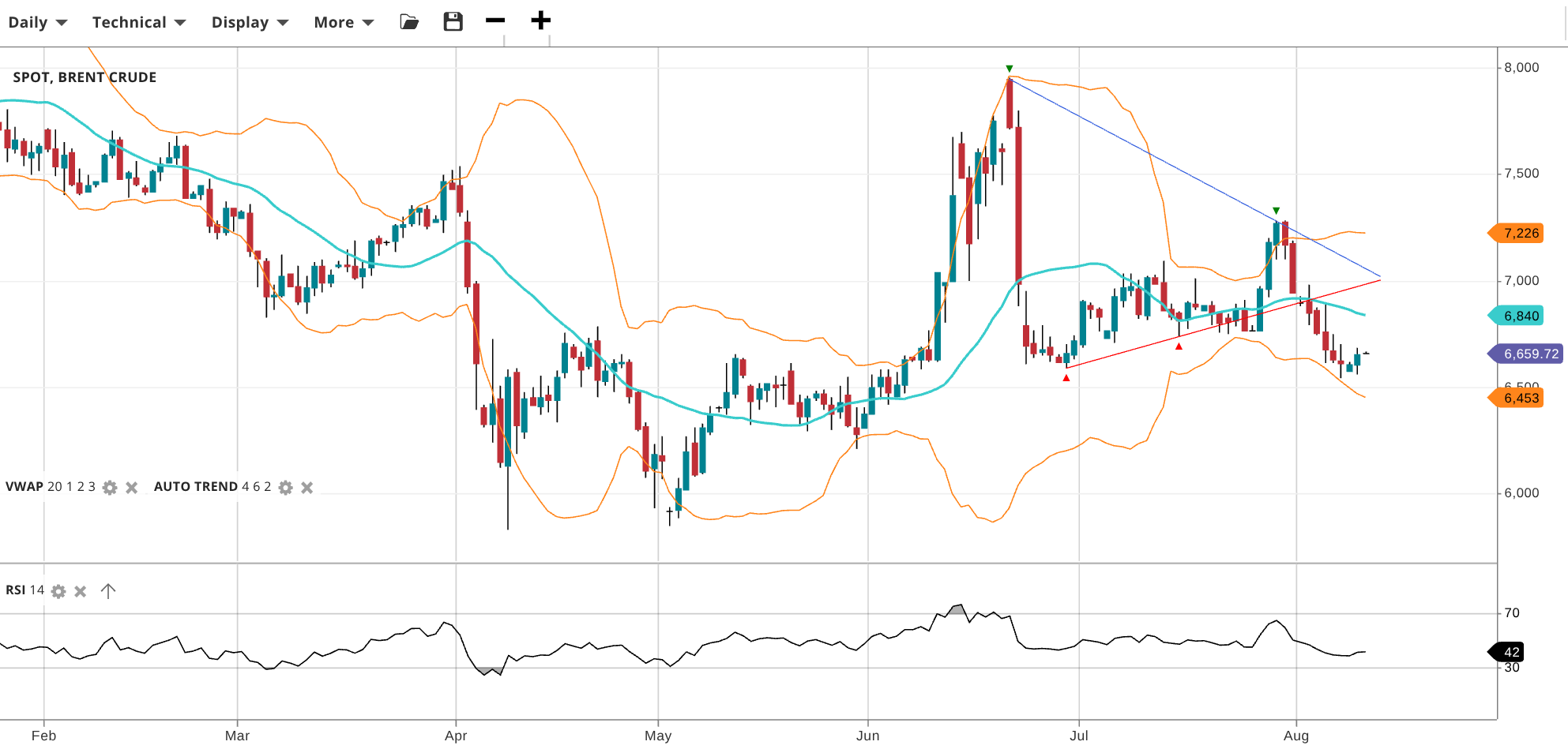Brent Crude continues in a choppy range but has broken down to a 2-month low, trading at 6,659, below its VWAP of 6,840. The RSI at 42 highlights new downside pressure. Support sits at 6,453 and resistance at 7,226.