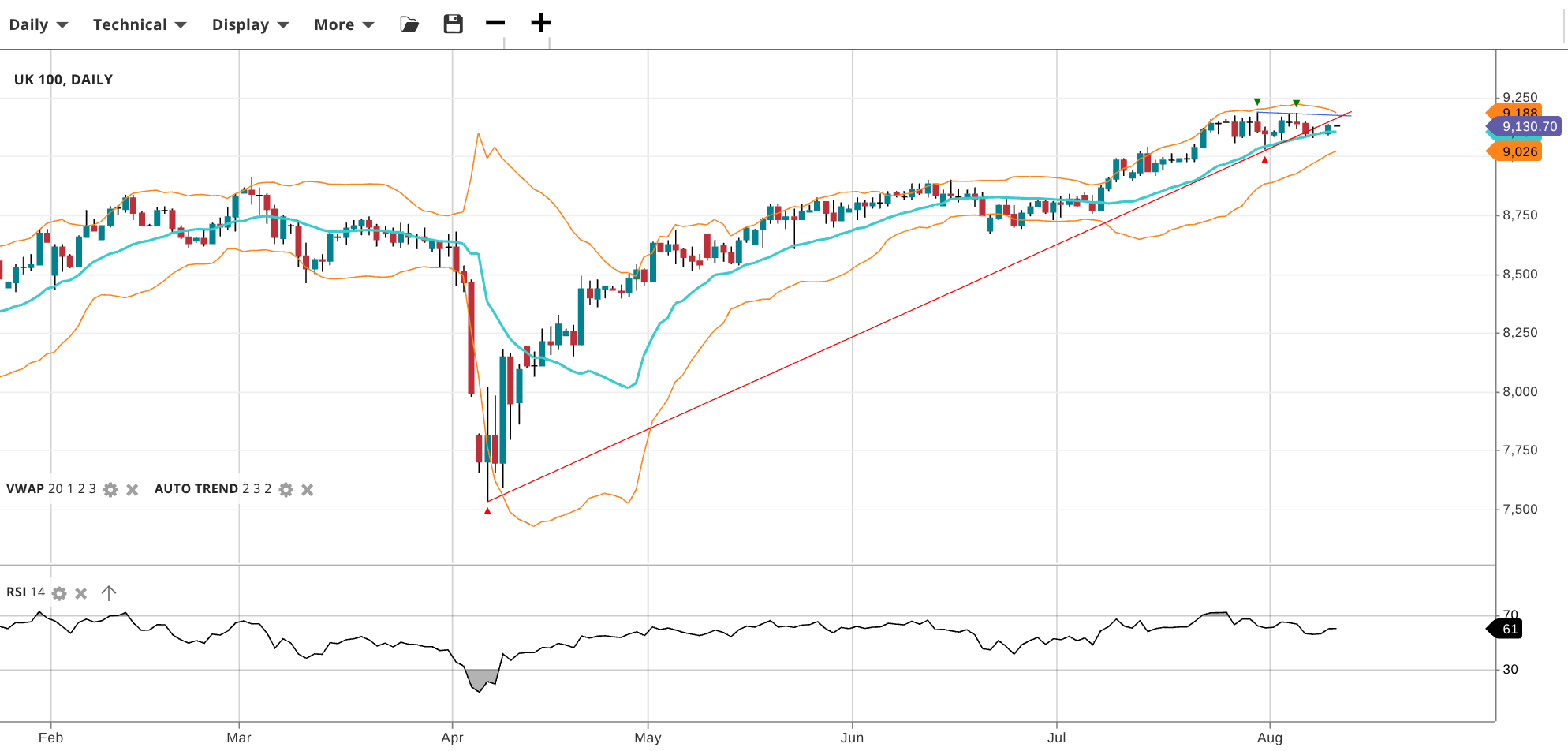 The UK 100 continues its bullish trend, undergoing a small pullback. Price is at 9,131, just above its VWAP of 9,120. RSI at 61 indicates steady bullish interest. Support is at 9,026 and resistance is at 9,188.