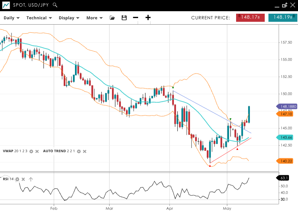 USD/JPY has broken back into a bullish trend and impulsive phase, trading at 148.19, well above its VWAP of 143.66. RSI at 63.1 (its highest since Jan) confirms the strong upside momentum. Support is located at 140.22, while resistance is at 147.10.