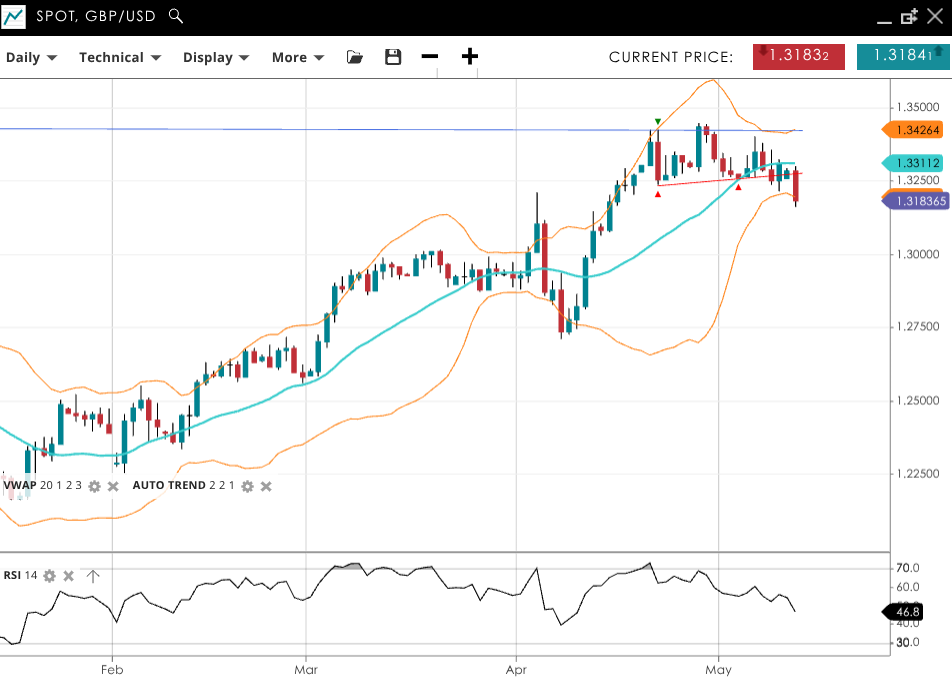 GBP/USD is correcting within what is still an overall bullish trend, trading at 1.3184 under its VWAP of 1.3311. RSI at 46.8 reflects fading strength. Support is at 1.3200, and resistance is seen at 1.3426.