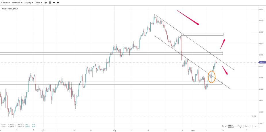 Wall Street found support at the round 31000 level and rebounded back into the bearish channel. A rally up to 32500 could be seen if 32000 holds firm. A break of 31000 might invalidate the upside bias. Moving past the channel top could extend the rally to 33000 and even 33500.