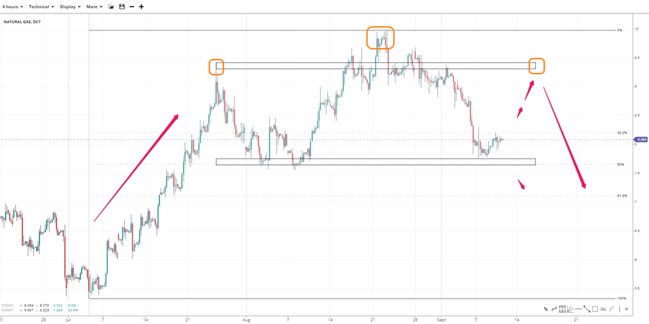 Natural gas has formed a double bottom below 7.80 unless it gets invalidated with another drop to the 50% Fibonacci of the 5.60-10.00 leg near 7.60. In either case, an upward leg toward 9.40 could print the right shoulder of a potential H&S. If so, the golden pocket at 7.00 would be a major support. Lossing the 50% prematurely would open the door to 61.80% and invalidate the H&S.