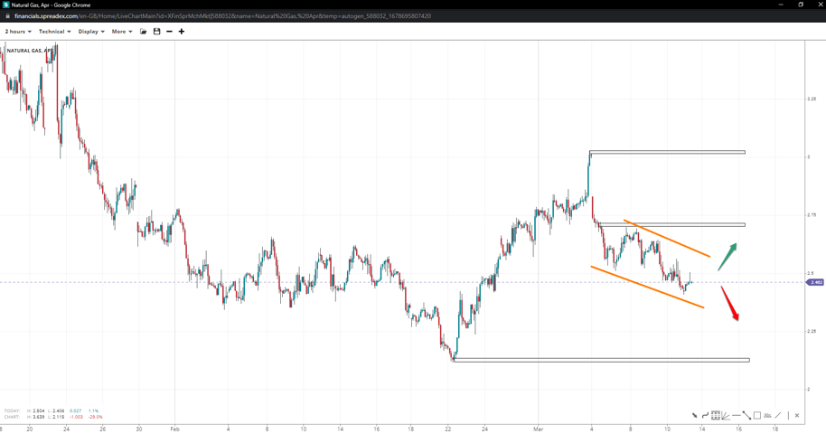Natural gas prices might be forming a flag pattern expected to compete soon. Failing to solidify the impulsive upward leg might encourage additional short, clearing the path to 2.11 and beyond. 2.70 is the short-term resistance bulls need control of for a chance at the peak of 3.03, provided the gap-filling causes no disruptions.