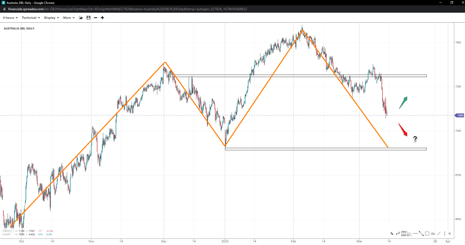 The head-and-shoulders has started to weigh on prices following the break of the 7880 swing, with the bearish continuation to 7670 offering an opportunity for a bounce. Holding the base might offer some respite towards 7850 and form a larger H&S unless it fails and kicks the door to 7500 open.