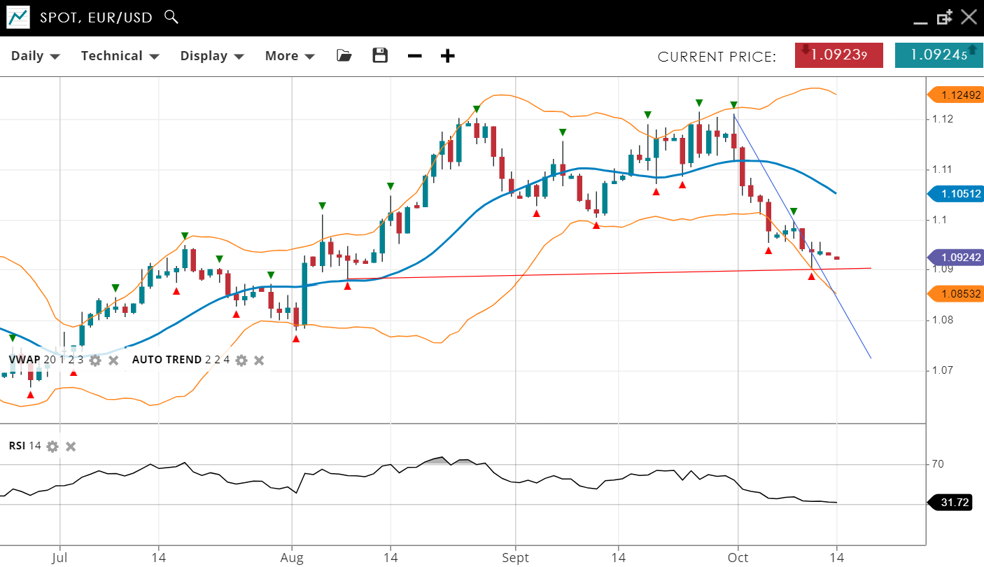 EUR/USD remains in a bearish trend, in an impulsive phase. The price is 1.0924, below the VWAP (20) of 1.1051. Support is at 1.0924, while resistance stands at 1.1249. The RSI is 31, signalling strong bearish momentum.