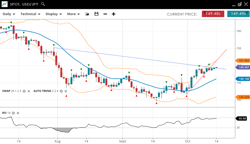 USD/JPY remains bullish, in an impulsive phase. The current price is 149.48, well above the VWAP (20) of 146.14. Support is at 140.83, and resistance is at 151.45. The RSI stands at 65, indicating strong bullish momentum.