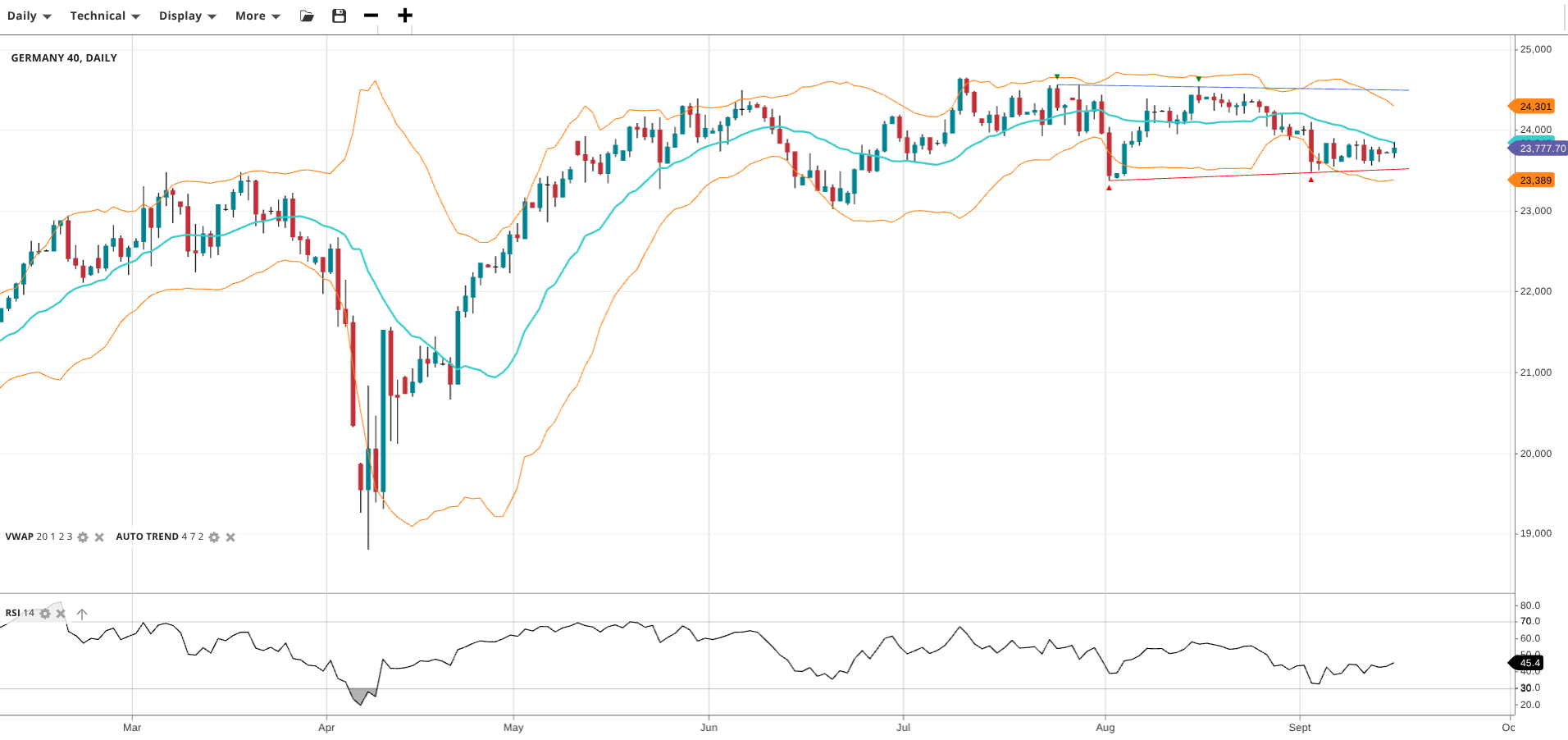 Germany 40 is in a neutral range phase, trading at 23,778, right around its VWAP of 23,790. RSI at 45.4 suggests softer momentum. Support is at 23,389, with resistance at 24301.