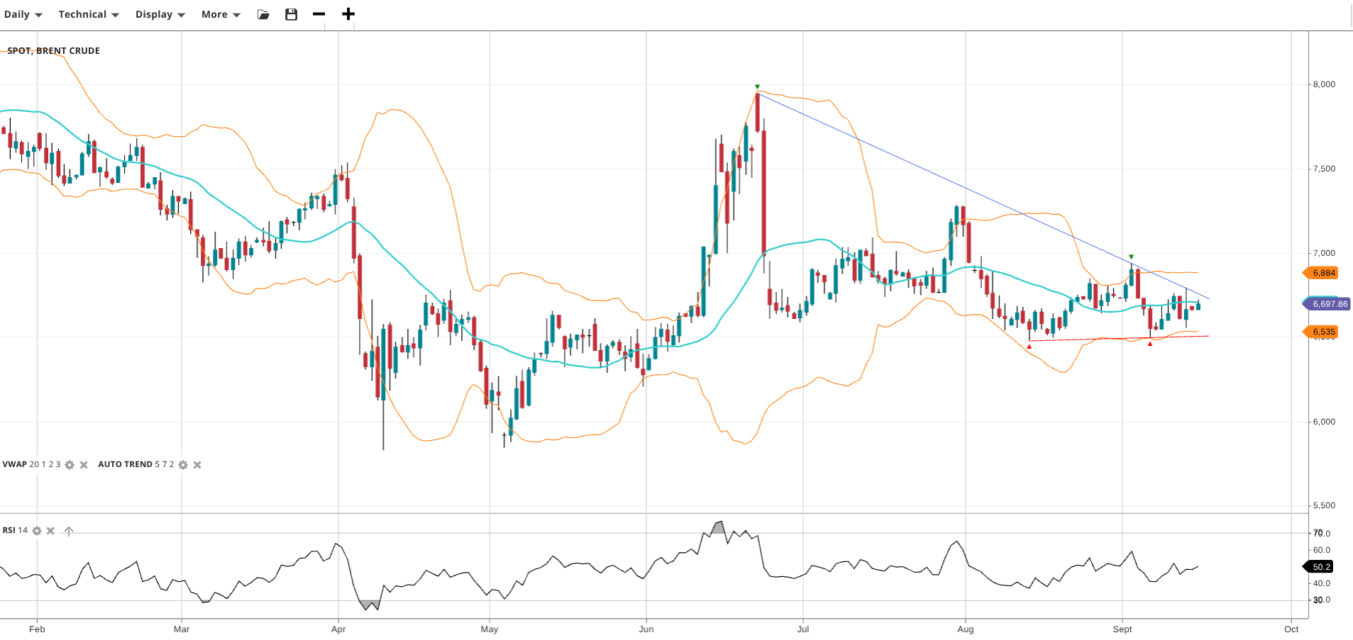 Brent Crude continues to consolidate in a range, trading at 6698 around its VWAP of 6698. RSI at 50.2 reflects balanced momentum. Support is at 6535, resistance at 6884.