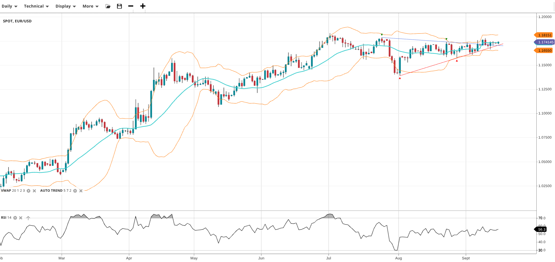 EUR/USD is bullish and remains in a correction, trading at 1.17145 near its VWAP of 1.17145. RSI at 56.3 points to steady upside interest. Support is 1.16550, resistance at 1.18151.