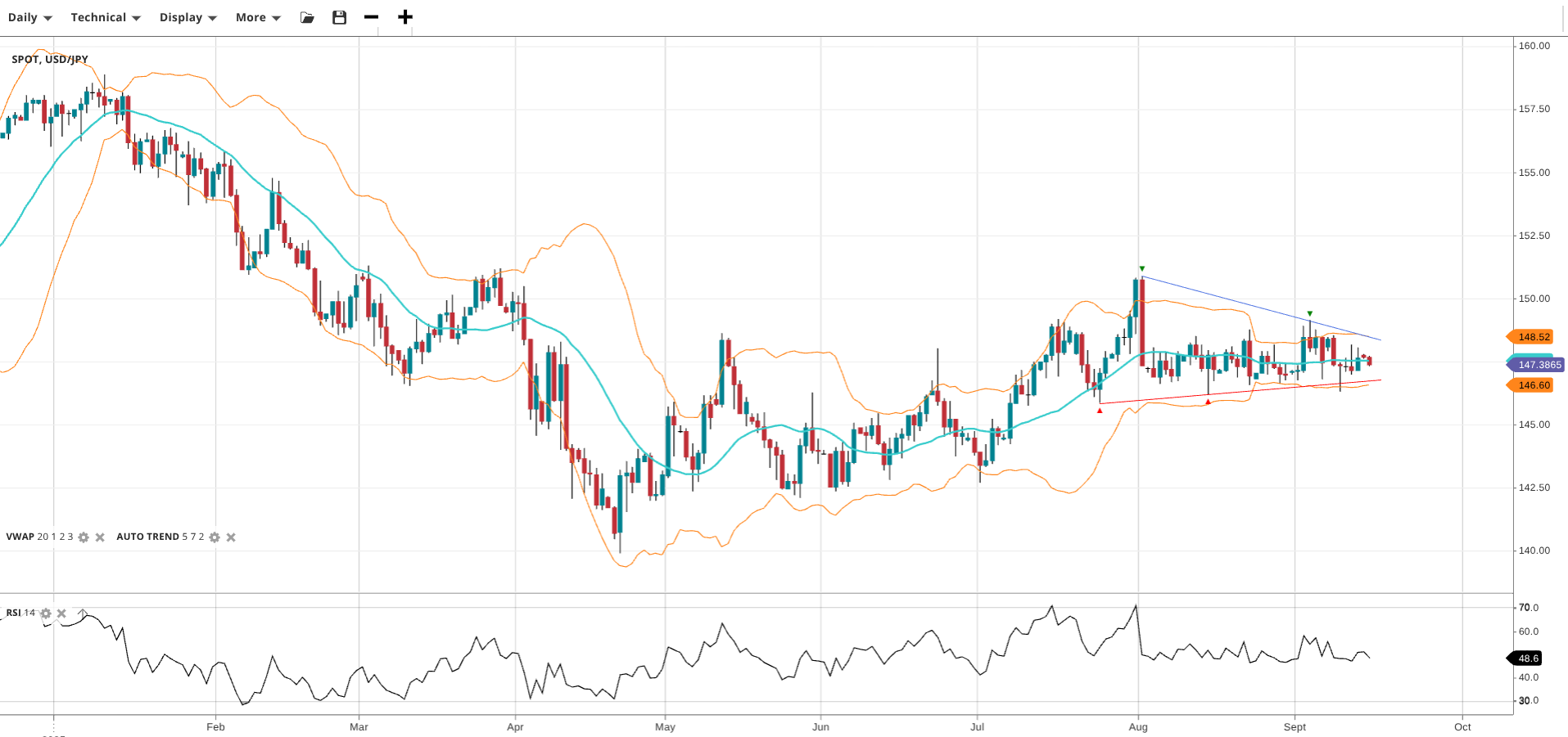 USD/JPY is range-bound, currently at 147.39 around its VWAP of 147.39. RSI at 48.6 shows a neutral market. Support sits at 146.60, resistance at 148.52.