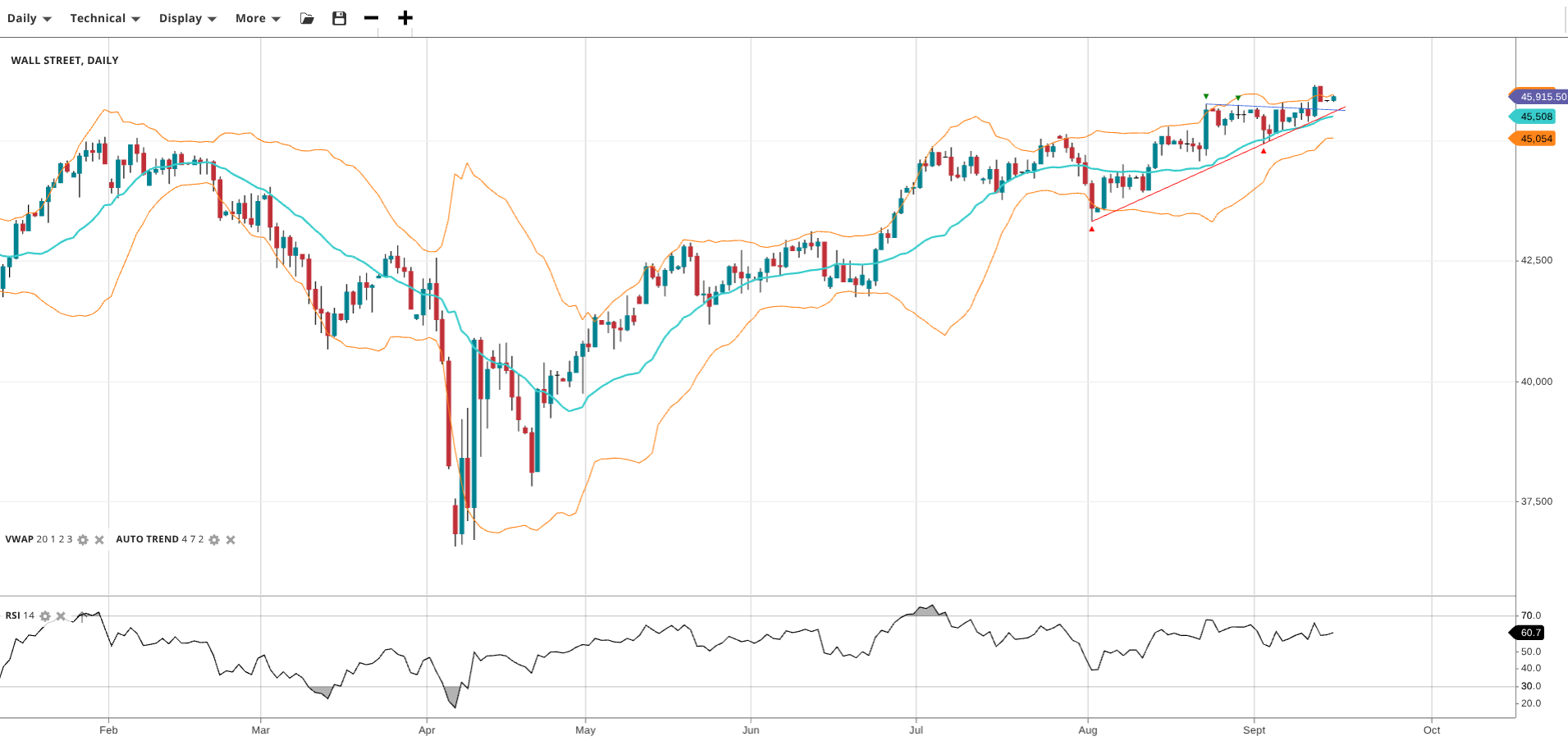 Wall Street remains bullish in an impulsive phase, currently at 45916 above its VWAP of 45508. The RSI at 60.7 indicates strong momentum. Support is at 45054, while resistance is at 45916.