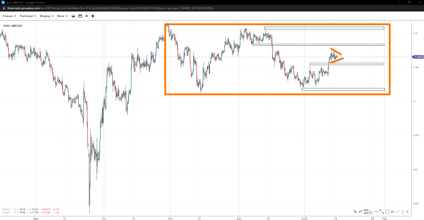 GBP/CHF is trading sideways but recently left the bottom range at 1.11 for a chance at 1.15. If the pair remains above 1.1280, it could break out of the short-term triangle pattern and move towards 1.1410.
