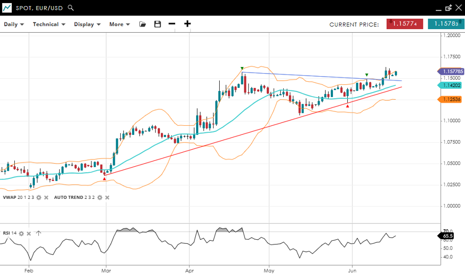 EUR/USD is consolidating within a bullish trend. The price at 1.1578 is well above the VWAP of 1.1420, showing underlying strength. The RSI at 65.5 suggests sustained buying interest. Support is at 1.1254, and resistance remains at 1.1579.