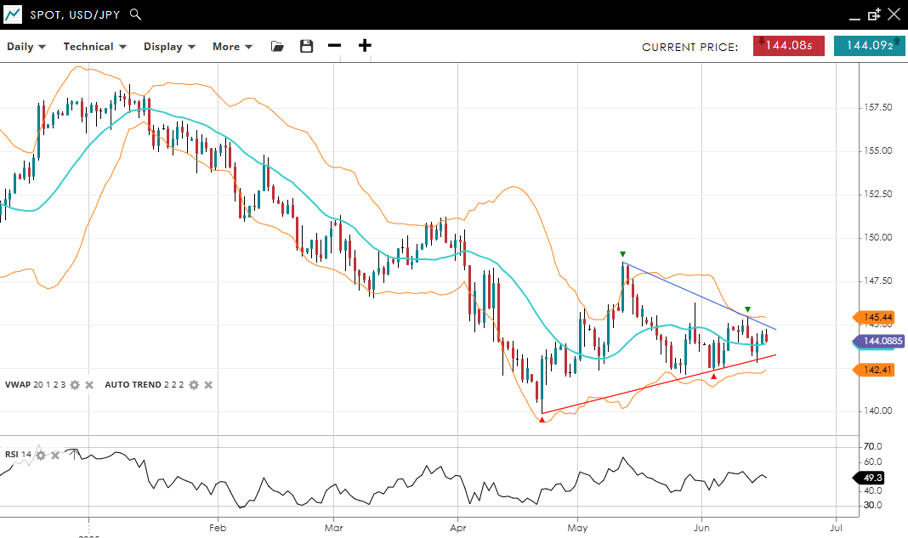 USD/JPY remains in a corrective phase of its bearish trend. It trades at 144.09, nearly matching the VWAP of 144.00. RSI at 49.3 shows neutral sentiment. Support is at 142.41, and resistance stands at 145.44.