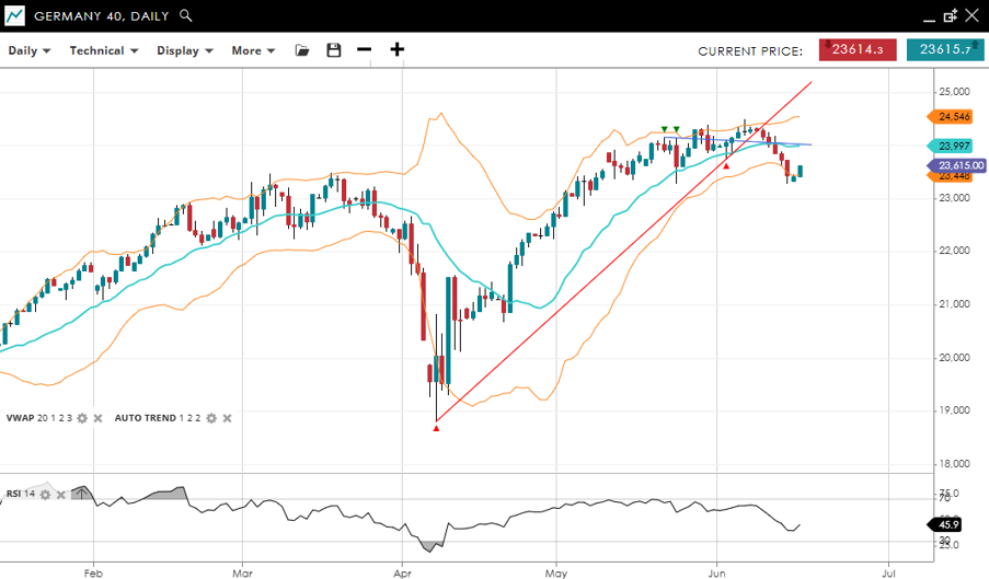 Germany 40 remains in a bullish trend but is currently in a correction phase. It is trading at 23,615, below its VWAP of 23,997, which suggests a potential loss of momentum. RSI at 45.9 reinforces the subdued tone. Support is at 23,448 and resistance is at 24,546.