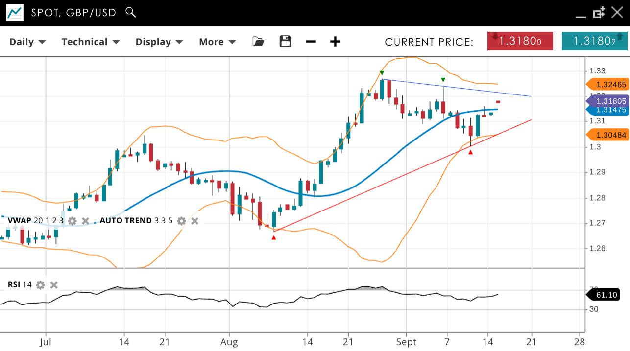GBP/USD remains in a bullish trend, currently in a corrective phase. The price is 1.3180, slightly above the VWAP of 1.3147. Support is at 1.3048, with resistance at 1.3246. The RSI at 61 suggests continued bullish momentum.