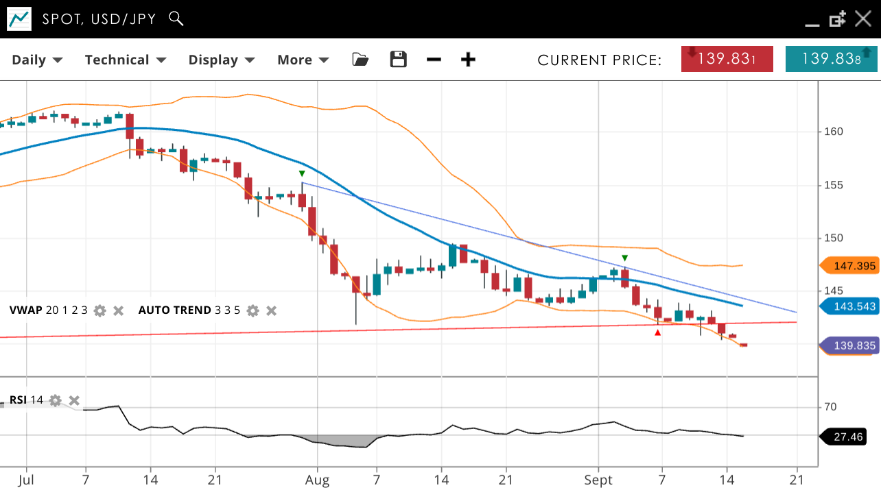 USD/JPY continues in a bearish trend, currently in an impulsive phase. The price is 139.83, below the VWAP of 143.54. Support is at 139.80, and resistance is at 147.39. The RSI at 27 reflects strong bearish momentum.