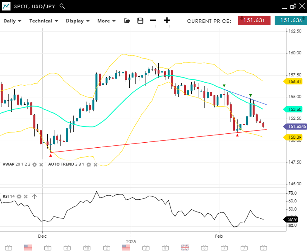 With the break of a long term trendline, USD/JPY has flipped into a bearish impulsive phase, currently at 151.30, well below its VWAP (20) of 154.75. Support is firm at 151.30, while resistance extends to 158.19. The RSI at 29 signals oversold conditions, confirming the new bearish trend in price.
