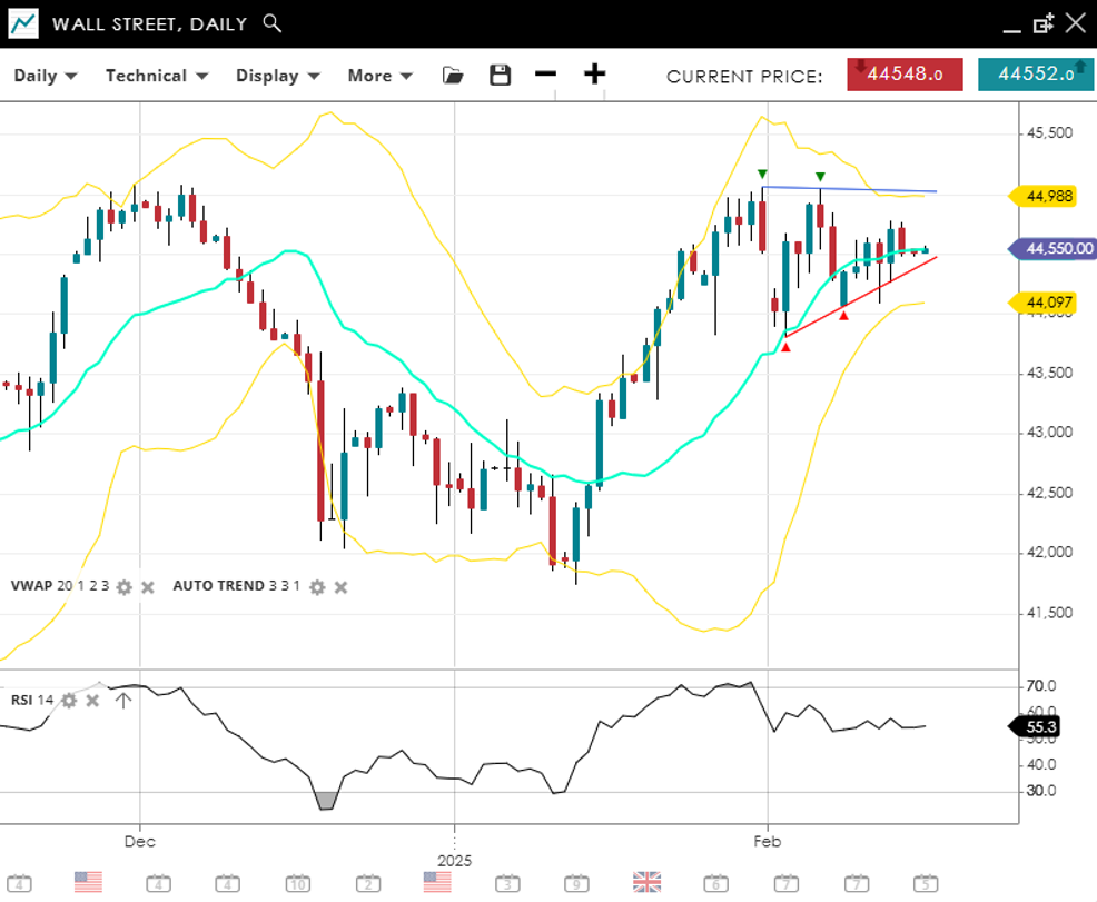 Wall Street has entered a corrective phase within its broader bullish trend, trading at 44,304, slightly above its VWAP (20) of 43,920 and having made a small double top at 45,000, matching the December record high. Key support is identified at 43,513, while resistance is set at 45,274. RSI at 53 suggests moderate momentum.