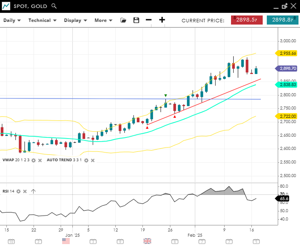 Gold remains in a very strong impulsive bullish phase, currently priced at 2,862, sitting comfortably above its VWAP (20) of 2,778 and close to a record high. Support is established at 2,670, while resistance is near 2,887. The RSI at 74 suggests overbought conditions, hinting at a possible pullback or consolidation before the next rally.